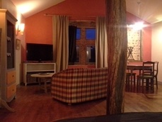 1 lit de 160 cm, TV, rangement, canapé, une mezzanine avec 2 lits de 80 (pour enfants), salle de bain avec douche, WC.